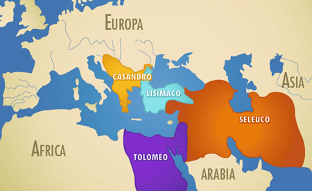 Mapa que muestra cómo se dividió el imperio de Alejandro Magno a su muerte. |